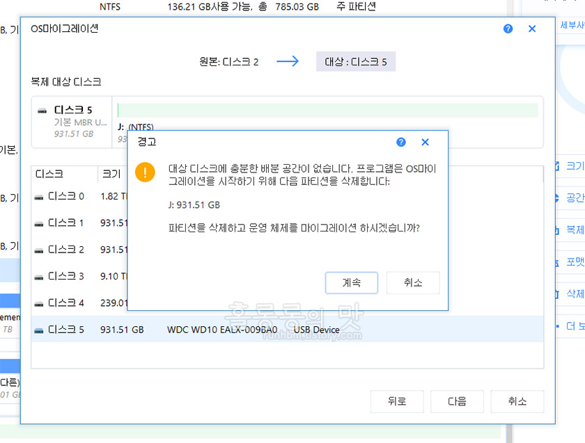 OS마이그레이션을 선택하면, 기본적으로 운영체제가 설치된 디스크가 '원본'으로 잡히고 복제를 하고 싶은 디스크를 직접 선택하게 됩니다. 제조사는 상관없습니다. 여기서 살펴야할 점은 원본 데이터를 다 담을 수 있을 만큼의 용량이 되는 '대상 디스크'를 선택하는 것만 신경쓰시면 됩니다.