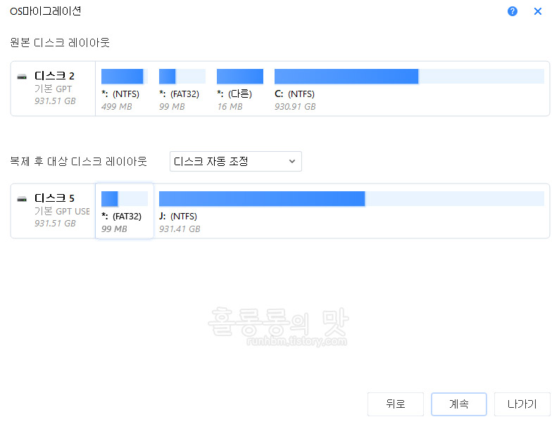 현재 운영체제 설치된 디스크의 환경과 자료를 그대로 따오는 작업입니다. 그래서 복제가 되는 디스크의 레이아웃도 기존의 디스크와 같은 형태로 이뤄지게 됩니다. 사실 여기까지는 일반적인 마이그레이션 툴하고 비슷합니다. 말 그대로 복제를 하는 것 뿐이니까요.