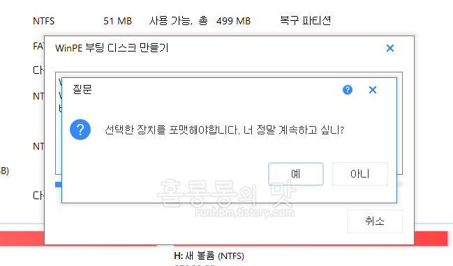운영체제 설치를 위한 디스크 환경이 조성되어야 합니다. 그래서 기존 파티션은 제거하고 운영체제를 담을 공간을 확보하는 걸 동의하냐는 경고 팝업이 뜹니다. 이 경우에는 다른 프로그램들도 다르지 않습니다. 마이그레이션을 하는 디스크에 있는 자료는 따로 옮겨놔야 합니다.